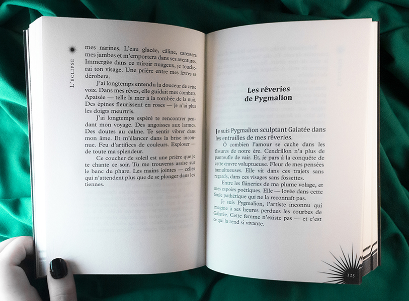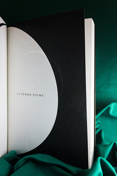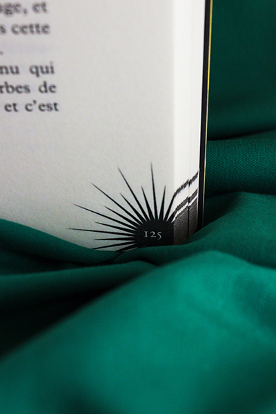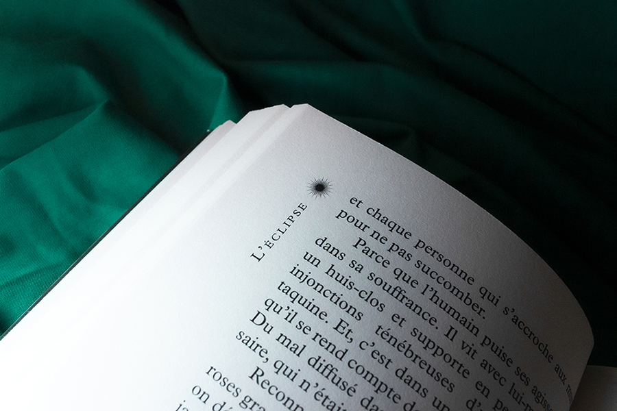 Notre choix s’est porté sur un hommage à la deuxième partie du livre intitulée «l’Éclipse». Nous avons opté pour de vastes aplats noirs qui révèlent des arcs et des cercles en réserve. Les textes, constitués de courtes Prosaimes selon l’auteure, ont été agencés avec une mise en page étroite, des marges généreuses et environ 40 signes par ligne.