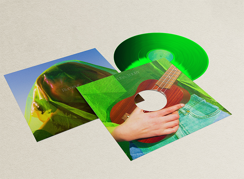 Création d’une pochette de vinyle pour une musicienne, des moodboards, croquis aux nombreuses prises de vue sur place avec des tissus.
